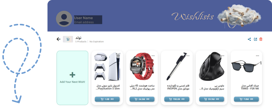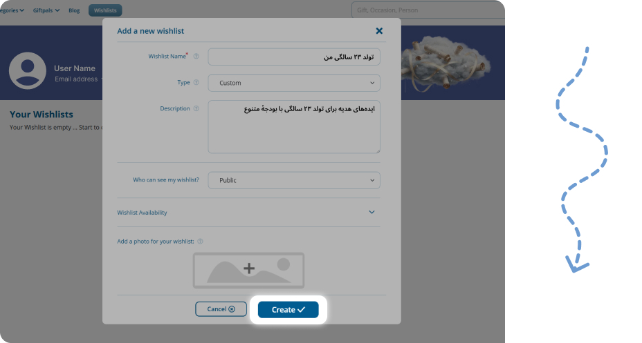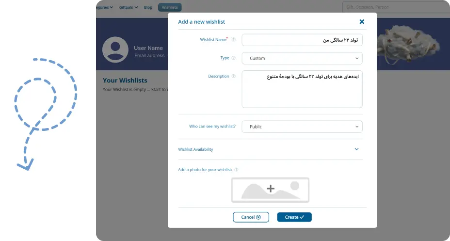 - Wishlist Name: نام ویشلیست (نمونه: «تولد ۲۳ سالگی من»).