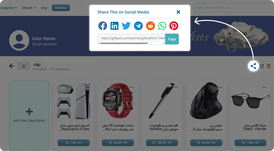 - پس از ساخت، لینک ویشلیست را کپی کرده و برای خانواده و دوستان بفرستید (پیامرسان، ایمیل یا شبکههای اجتماعی). آنها بدون نیاز به ثبتنام طولانی میتوانند ببینند و خرید کنند.