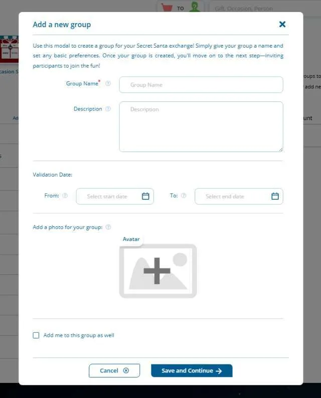 In the group setup panel, you’ll first give your Secret Santa event a clear, festive name—something like “2025 Office Holiday Swap” or “Family Winter Surprise.” Then you need to add more details, like event description or the event period. finally you can set a fun and related image for the group.