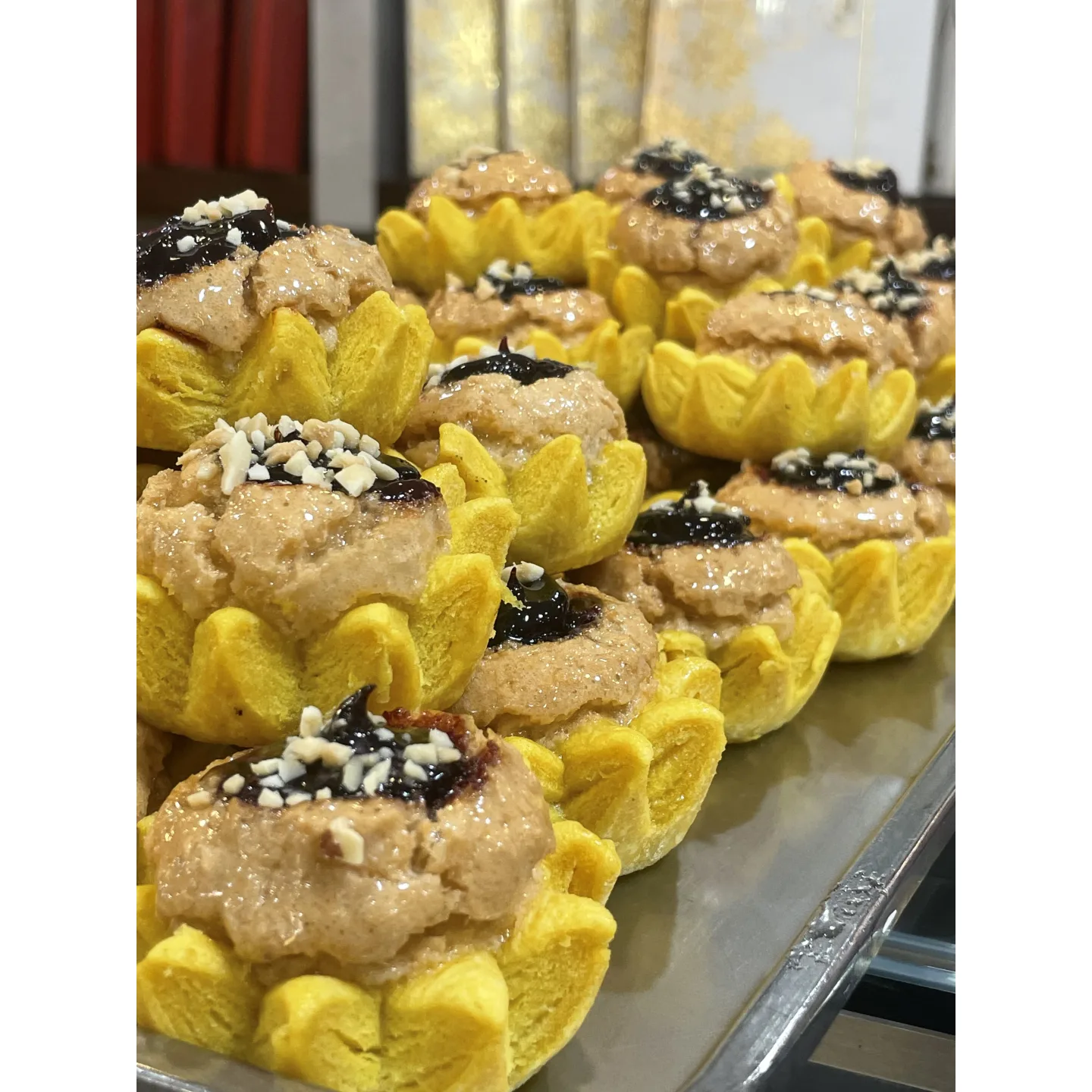 شیرینی مغزدار زعفرانی گل آفتابگردان – شیرینی مجلسی با طراحی گلمانند، ترکیبی از طعم زعفران، مغز بادام و مربای طبیعی.
