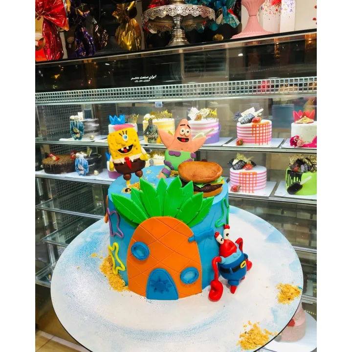 کیکی شاد و پرجزئیات برای جشنهای کودکانه؛ زمینهٔ آبی دریایی با مرجان و ستارههای دریایی، عروسکهای فوندانتی باباسفنجی، پاتریک و آقای خرچنگ بههمراه «خانهٔ آناناسی» و برگر نمادین. بافت اسفنجی...