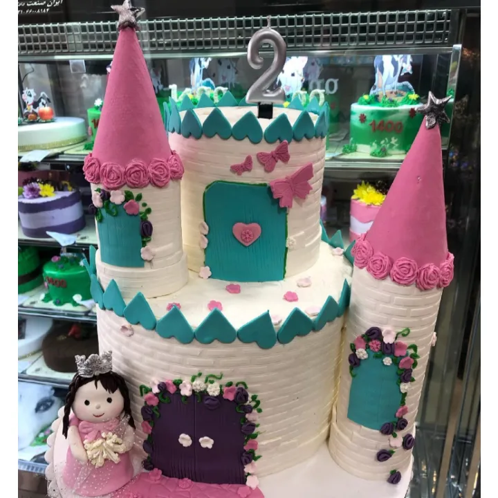 کیک تولد قلعه پرنسسی صورتی فیروزهای دخترانه عروسک دستساز فانتزی