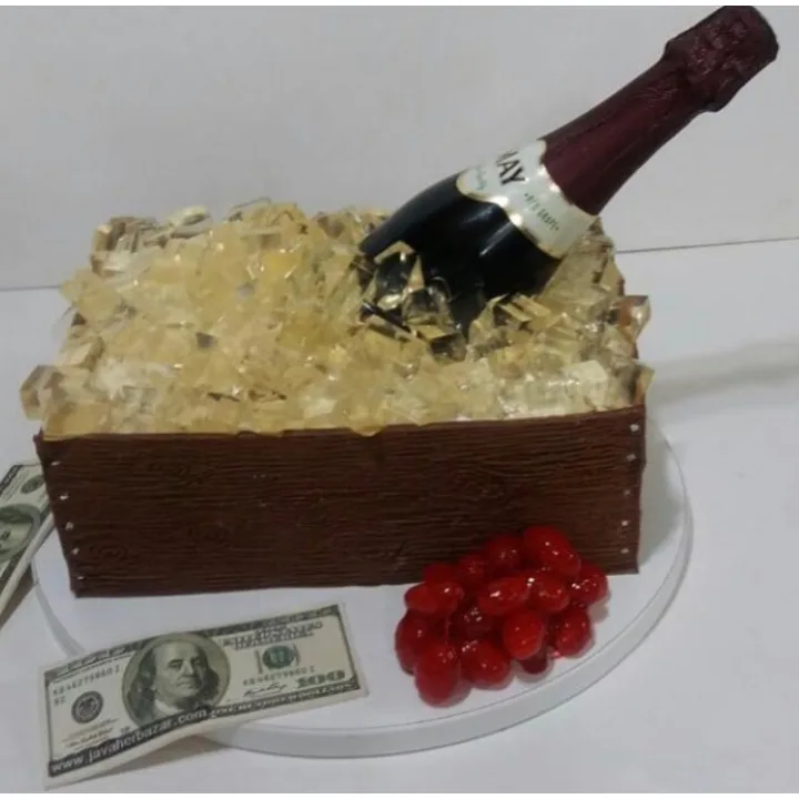 این کیک خاص با طراحی جعبه چوبی، بطری نوشیدنی و تکههای کریستالی یخی از ژله خوراکی ساخته شده است. جلوهای بسیار شیک و واقعگرایانه دارد که آن را به انتخابی محبوب برای جشنهای بزرگسالان، مدیران، یا دوستان خاص تبدیل میکند. ظاهر مجلل و تم نمادین پول و نوشیدنی، حس لوکس و موفقیت را القا میکند.