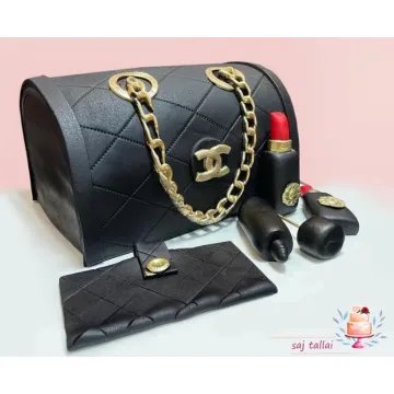 کیکی چشمنواز و متفاوت با طراحی الهامگرفته از برند معروف Chanel؛ ظاهری شبیه کیف دستی چرم مشکی با زنجیر طلایی و اکسسوریهایی همچون رژ لب و کیف پول. این کیک لاکچری انتخابی ایدهآل برای جشنهای تولد بانوان، دختران نوجوان و دوستداران دنیای مد و فشن است.