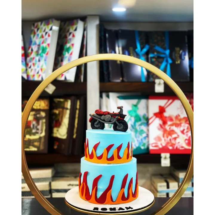 کیک سفارشی-موتورسیکلت دوطبقه-آبی قرمز-تولد-تاپر سهبعدی-تم آتش