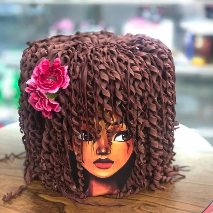 کیک سفارشی پرتره مو فرفری قهوهای شکلاتی تولد بافت مو سهبعدی هنری