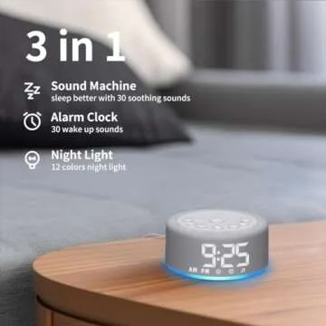 Show more Introducing the ultimate sleep companion: the 3 in 1 Sound Machine Alarm Clock Night Light. This versatile device combines cutting-edge sound technology with a stylish design, ensuring you experience the perfect ambiance for rest and wakefulness. With a plethora of 27 soothing sounds and 30 alarm options, it's tailor-made for every user from newborns to adults. Plus, the integrated 12-color night light creates an ideal sleeping atmosphere, making it a perfect addition to any room.