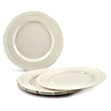 Show more Introducing the Occasions Chateau Collection – the epitome of elegance for your dining experience. This exclusive set of 50 heavyweight disposable plates is designed to impress, featuring a sophisticated Ivory color that mimics the look of fine china. Crafted for upscale gatherings such as weddings, holidays, or any special event, these premium plates strike the perfect balance between stunning aesthetics and practical convenience. Made from extra-strong plastic, they provide the durability you need while offering a delightful presentation for your culinary creations.