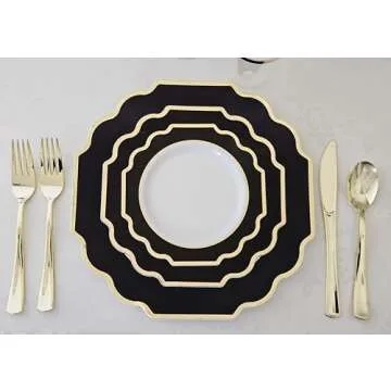 Each pack includes 50 plates, featuring 25 dinner plates (10.5 inches) and 25 appetizer/dessert plates (8 inches). Made in an elegant white with black and gold accents, the design adds a classic touch to celebrations such as weddings, anniversaries, and baby showers. Guests will be amazed at the high-quality look and feel, often mistaking them for premium reusable dishware. Surprisingly sturdy, they won't buckle under the weight of food or desserts, which is a common concern with disposable dinnerware.