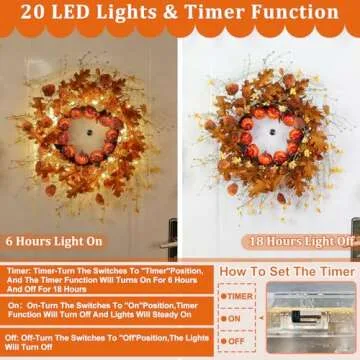 Timer & Thick 22 Inch 20 LED Fall Wreaths for Front Door Decor with Pumpkins and Eucalyptus