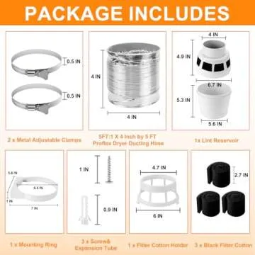 Show more The Upgrade Indoor Dryer Vent Kit is an essential solution for those living in spaces where outdoor ventilation is not an option. This innovative kit allows you to efficiently ventilate your electric clothes dryer indoors, effectively removing dust and trapping lint to maintain a cleaner environment. The package includes a 4 Inch by 5 FT Proflex Dryer Ducting Hose, a Lint Reservoir, three Black Filter Cottons, two Metal Adjustable Clamps, a Wall Mounting Bracket, two Screws and Expansion Tubes, and a Filter Cotton Holder for a complete venting solution.