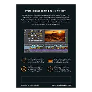 Show moreUnleash your creativity with VEGAS Pro 17 Edit, the ultimate software solution for professional video and audio editing. Whether you are a seasoned filmmaker or an aspiring content creator, VEGAS Pro 17 Edit is designed to deliver cutting-edge features that elevate your projects to the next level. With its powerful capabilities for image stabilization, you can transform shaky footage into smooth, cinematic scenes while the innovative nested timeline organizes your workflow effectively for maximum efficiency. Packed with the latest in video editing technology, this software also includes planar motion tracking and Optical Flow slow motion, ensuring that your transition effects and slow-motion sequences look nothing short of mesmerizing. Don’t just edit; create breathtaking visual narratives that captivate your audience.