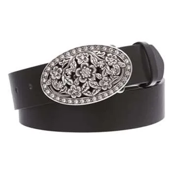 1 1/2" Women's Snap On Belt With Oval Perforated Engraved Crystal Rhinestone Western Floral Buckle, Black | s (30"~32" waist)