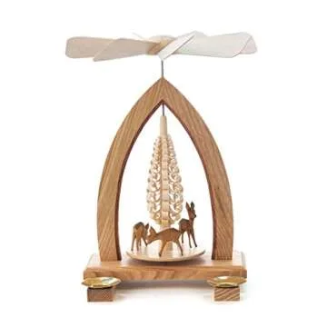 Show moreExperience the enchanting charm of Christmas with the stunning 1-Tier German Christmas Pyramid featuring a delightful deer design. Made by the renowned artisans at Dregeno Seiffen, this striking decoration stands at 25cm / 10 inches tall, perfect for adding a touch of traditional German festive spirit to your home. This exquisite piece is crafted with meticulous attention to detail, ensuring a breathtaking display as it twirls gracefully when warmed by the candles placed beneath. Transport yourself to a winter wonderland with this nostalgic symbol of holiday celebration, effortlessly merging craftsmanship and artistry that will captivate guests of all ages.