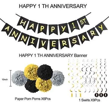 1 Year Anniversary Decorations Kit, 1st Wedding Anniversary Banner Party Decorations Suppilies - Including Gold Glitter Happy 1th Anniversary Banner / 9Pcs Sparkling 1 Hanging Swirl /6Pcs Poms…