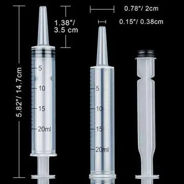 Show more Discover the ultimate solution for precise liquid dispensing with our 10 Pack Plastic Syringe Liquid Measuring Syringes. Each syringe measures 20 ML and comes completely needleless, making them versatile enough for a variety of applications—from scientific labs to home gardening, and even for your beloved pets. These syringes are perfect for injecting epoxy when you're repairing sunshades, administering medication to small animals, or dispensing plant nutrients. With individual packaging, you can trust that each syringe remains clean and hygienic until you're ready to use it. Lightweight yet sturdy, they are designed to provide ease of use, making them a favorite among DIY enthusiasts and professionals alike.