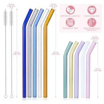 Show moreExperience the joy of sustainable sipping with our 10 Pcs Reusable Colorful Bent Glass Straws! These vibrant straws are crafted from food-grade borosilicate glass, ensuring they are not only dishwasher safe but also shatter-resistant. Available in two convenient sizes, each set includes 5 pieces of 9''x10mm straws for your larger beverages, and 5 pieces of 6''x10mm straws, perfect for cocktails or coffee. Their transparent design allows you to see the rich colors of your drinks while making a stylish statement at any gathering.