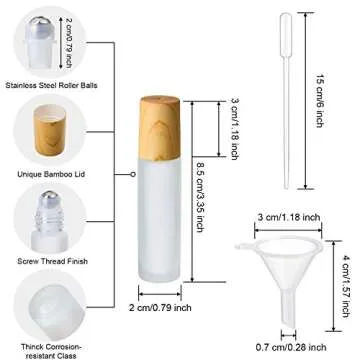 Show more Introducing the 10 Piece Frosted Glass Roller Bottle Bulk, your ultimate solution for on-the-go essential oil application and storage. This carefully curated set includes 10 elegant 10 ml frosted glass roller bottles, each topped with an imitation wood grain plastic cap, adding a touch of sophistication to your collection. Designed not only for beauty but also functionality, these bottles come complete with 10 plastic pipettes and 2 funnels, making refilling and transferring liquids a breeze. Imagine carrying your favorite essential oils, body lotions, or perfumes with ease on your next trip!