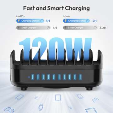 Show more Introducing the ultimate charging solution for your tech-savvy lifestyle: the 10 Ports Charging Station. Designed to effortlessly charge all your devices, this powerful charging station delivers an impressive 120W total output, efficiently handling up to 10 devices simultaneously. Whether it's your iPhone, iPad, Tablet, or Kindle, rest assured each port provides a stable 2.4A of power, ensuring your gadgets are filled up with energy in no time.