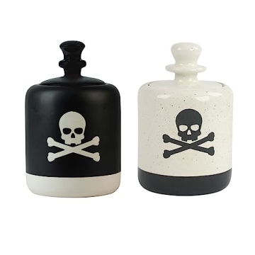 Show moreIntroducing a delightfully spooky addition to your kitchen, this exquisite set of 2 canisters features one matte black jar and one speckled white and black poison jar. Crafted from high-quality ceramic, these canisters are not only functional but also serve as decorative accents that will enchant your guests. Each jar is designed with a silicone seal on the lid, ensuring that your cookies, candy, and other ghoulish treats remain fresh and irresistible.