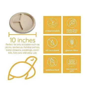 100% Compostable Disposable Paper Plates Bulk [10" 3-Comp 50 Pack], Bamboo Plates, Eco Friendly, Biodegradable, Sturdy Large Dinner Party Plates, Heavy-Duty, Unbleached by Earth's Natural Alternative