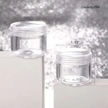 Show moreIntroducing the 100 Count Clear Plastic Sample Containers - your ultimate solution for all storing needs! With a capacity of 20g (0.68oz), these versatile containers are crafted to perfection for securely storing creams, lotions, lip balms, and even nail decoration supplies. Made from durable, high-quality plastic, they ensure a reliable and leakproof solution for both personal and professional use. Whether you're a DIY enthusiast, a small business owner, or a creative artist, these jars are designed to meet your diverse storing requirements. Their sleek design and transparent finish provide optimal visibility while maintaining a professional appearance.