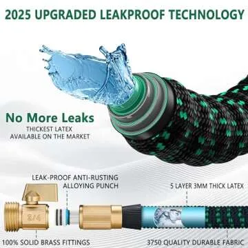 Show more Introducing the 100 ft Garden Hose Expandable Hoses! This 2025 upgraded flexible water hose is a true game-changer for all your watering and cleaning needs. Designed with versatility in mind, it stretches from an initial 33.4 feet to an impressive 100 feet when connected to a water source. Crafted from a high-density 3-layer latex core and a 100% solid brass connector, this hose promises to deliver superior durability and leakproof performance. The top quality 3750D polyester fabric cover ensures that the hose can withstand any outdoor conditions while preventing breakages and leaks. Its lightweight construction allows for easy maneuverability and effortless storage, making it the ultimate tool for every gardener!