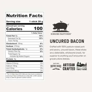 100% Pasture Raised and Naturally Fermented Pork Snack Meat Sticks with Bacon by Singing Pastures, 1 Ounce Sticks, (Pack of 12), Keto and Paleo Friendly Diet, Low Carb, Gluten Free, High Protein