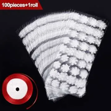 100 Pcs Christmas Cellophane Bags Winter Snowflake Holiday Treat Bags Snowflake Cookie Cellophane Bags With Ribbon for Winter Holiday Party Supplies(White Bag with Red Ribbon)
