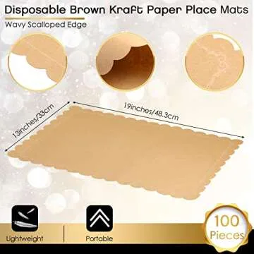 The rustic brown scalloped design adds a touch of warmth to your table decor, making it suitable for various settings, from formal dinners to casual family meals. The classic decorative corner frame enhances the overall look without overwhelming your existing tableware. A standout feature of these placemats is their disposable nature - made from durable 80g Kraft paper that resists breaking and deforming, they simplify post-meal clean-up while offering a chic aesthetic.