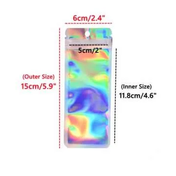 Show moreBring a touch of sparkle to your packaging with our 100 Pcs Resealable Holographic Bags! Perfectly designed for small treasures, these bags boast a shimmering holographic finish that turns mundane packaging into eye-catching presentations. Each bag measures 2.4x5.9 inches externally, with an inner size of 2x4.6 inches, making them ideal for a variety of small products—from snacks and cosmetics to jewelry and party favors. Crafted from high-quality metalized film, these durable bags not only shine brilliantly but also effectively showcase the contents at a glance due to their clear front panel.