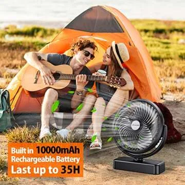 Show more If you’re looking for the ultimate portable fan that seamlessly combines functionality, durability, and convenience, look no further than this remarkable 10000mAh Polymer Battery Portable Fan. This innovative fan is engineered to deliver powerful cooling performance without the hassle of constant power source dependency. Equipped with a colossal battery that ensures more than 35 hours of operation at low speed and 8 hours at the highest speed, it’s the perfect companion whether you're camping in the wilderness or enjoying a cozy day at home.
