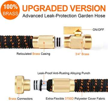 Show more Transform your gardening experience with our revolutionary flexible expanding garden hose! This remarkable product is crafted with a high-density double-layer latex core paired with a durable 3750D polyester fabric cover, ensuring it withstands high water pressure and a variety of temperatures ranging from 41℉ to 113℉. The maximum length of 100 feet allows you to effortlessly cover large areas—whether you’re watering your garden, washing your car, or cleaning your patio.