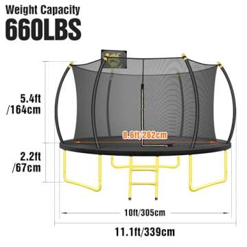 The trampoline has a diameter of 10FT, making it ideal for various outdoor spaces.