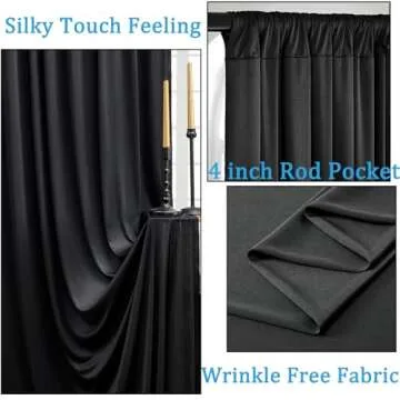 Show more Transform any occasion into a stunning visual experience with our 10ft x 10ft Wrinkle Free Black Backdrop Curtains. Each set includes two panels measuring 5ft x 10ft, providing a generous total width of 10ft and height of 10ft, perfect for creating an elegant and sophisticated environment. Crafted from high-quality polyester, this backdrop drape not only lends a sleek black finish to your space but also ensures durability and ease of maintenance. These curtains are designed with wrinkle-free fabric, making them soft to the touch and visually appealing, while allowing for beautiful draping or a flowing look that will elevate your event decor.
