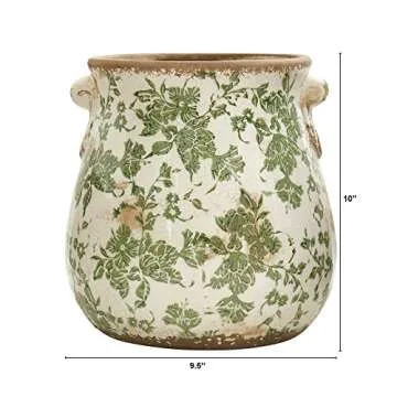 Show moreIntroducing the exquisite 10in. Tuscan Ceramic Green Scroll Planter, a masterpiece designed to elevate your indoor decor. Crafted with a stunning floral print, this vintage-inspired ceramic vase effortlessly embodies the charm of rustic elegance. The eye-catching green flowers beautifully contrast against a rugged backdrop, creating a homey feel that transforms any space into a cozy haven. With dimensions of 9.5 in. W x 9.5 in. D x 10 in. H and a generous container volume of 15.62 Qt, this planter is perfectly sized for your favorite faux or real greenery. While it does not feature drainage holes and is designated for indoor use, it adds significant character to your living area.
