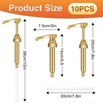 Show more Transform your coffee experience with the 10Pcs Gold Squirt Syrup Pump, a perfect accessory for your kitchen, dining, or bar setup. Designed specifically for 750ml bottles, these syrup pumps are constructed from high-quality, non-toxic plastic that is both durable and safe. Each pump measures approximately 15 inches in length, with a tube length of 11.6 inches, making them adaptable for various syrup containers. What sets this product apart is its adjustable design, allowing you to minimize waste by dispensing syrup directly from the bottom of the bottle, ensuring you get every drop without messy spills.