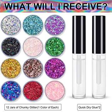 Show more Unleash your creativity and add a dazzling touch to your beauty regimen with our stunning set of 12 Colors of Cosmetic Holo Chunky Glitter. Each pot shines brightly with a unique blend of hues including vibrant Silver, Gold, Purplish Red, and Turquoise that will cater to your every aesthetic desire. Whether you're looking to channel your inner unicorn or just add some sparkle to your day, this glitter set features a magnificent variety sure to impress.