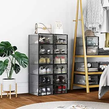 12 Pack Shoe Boxes Clear Plastic Stackable,Shoe Storage Containers with Lids for Boots Sneaker Shoe Organizer Bins,Easy to Assemble & Waterproof Shoe Storage Cubes for Mens Women Kids Shoes
