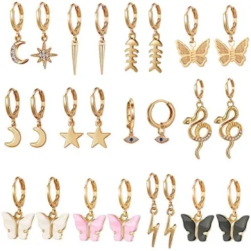 Show moreIntroducing the exquisite 12 Pairs Gold Butterfly Earrings for Women – your ultimate jewelry blend of charm, elegance, and versatility. This stunning set features a delightful assortment of small hoop earrings with intricate designs including delicate butterfly dangles, enchanting moons, sparkling stars, edgy lightning bolts, and whimsical animal motifs. Each pair is crafted to effortlessly enhance any outfit, ranging from casual denim looks to chic evening attire. Embrace the unique nature of these earrings, perfect for every occasion, and elevate your accessory game with this magnificent collection!