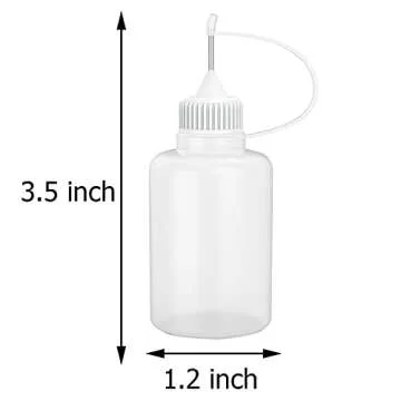 Show more The Needle Tip Glue Bottles set features 12 high-quality applicator bottles equipped with white lids, designed specifically for precision and ease in crafting. With a bottom diameter of 1.2 inches and a height of 3.5 inches, each bottle can hold up to 1 ounce of liquid. The translucent material allows you to easily monitor the liquid levels, making them perfect for various detail-oriented projects.