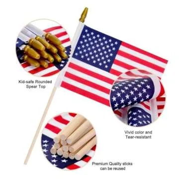 Show more Introducing the delightful pack of American flags, perfect for any festive occasion! Bursting with vibrant colors and crafted from high-quality polyester, these flags are built to last. Each flag measures 4 x 6 inches and comes attached to a sturdy 10-inch wooden staff, ensuring they maintain their prideful stance whether indoors or outdoors.