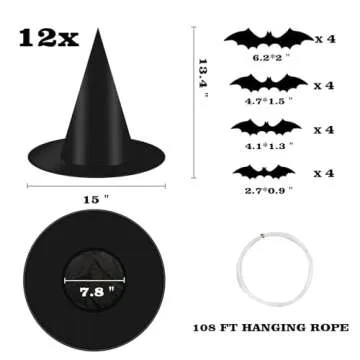 12 PCS Black Witch Hat with Hanging Rope & 16 PCS 3D Bats Stickers for Halloween