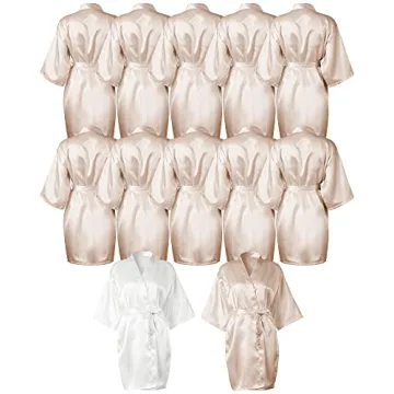 Show moreIntroducing a delightful ensemble of 12 elegant satin robes, available in a harmonious blend of white and champagne colors. Each robe is expertly crafted from high-quality polyester, ensuring a soft, skin-friendly experience that is both reliable and durable. The luxurious material is designed to resist fading and deformation, allowing you to enjoy these stunning robes for a long time. Each robe features a deep V-shaped neckline, beautifully showcasing your figure while providing comfort and style. With long, adjustable belts, you can customize the fit to accentuate your lovely curves.