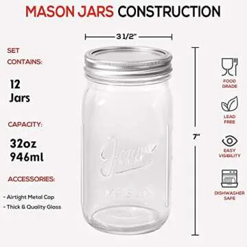 Introducing your new kitchen essential: the 12 Pcs Wide Mouth Mason Jars 32 Oz. Crafted from high-quality, lead-free glass, these large canning jars offer durability and clarity to showcase your culinary creations. The generous 32 oz capacity is perfect for storing a variety of items, from fresh produce to homemade jams and preserves. Featuring a wide mouth design with a 3 1/2-inch diameter, these jars make filling and cleaning a breeze. They come complete with airtight silver lids that have...