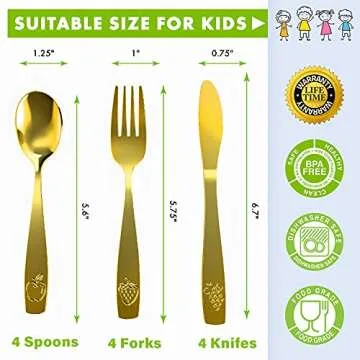 Show moreIntroduce your little ones to the joy of dining with our 12 Piece Stainless Steel Kids Silverware Set - a collection designed specifically for children to feel empowered and confident at the dinner table. This charming cutlery set includes 4 forks, 4 spoons, and 4 knives, all sized perfectly for tiny hands and mouths. The smooth, rounded edges and ergonomic design ensure a pleasant and safe eating experience while fostering your child's independence during mealtime. With its eye-catching gold finish, this set not only provides functionality but also adds a touch of elegance to your dining table.