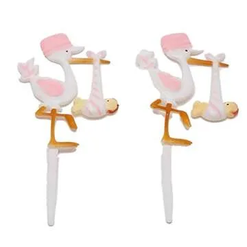 12 Plastic Pink Stork baby shower favors appliques floral cupcake picks 7" tall