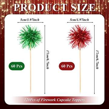 Show moreElevate your holiday gatherings with our vibrant 120 Pcs Christmas Firework Cupcake Toppers. Crafted from high-quality red and green foil, these stunning cake topper sticks add a festive touch to your desserts and drinks. Each topper features an eye-catching firework design, making your treats the highlight of the celebration. The set includes 120 pieces, ensuring you have plenty for cupcakes, cakes, and even cocktails! Let your creativity shine as you decorate your festive treats.