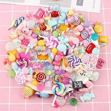Show more Unleash your creativity with our 120 Pcs Slime Charms Mixed Candy Sweets Resin Flatback Slime Beads, specifically designed for DIY enthusiasts and crafty kids alike! These charming beads, crafted from high-quality resin, are lightweight yet sturdy, making them perfect for various crafting projects. Each set includes a vibrant assortment of shapes such as mermaid tails, cartoon unicorns, sea shells, starfish, rainbows, candy, and cakes. Our slime charms are not just durable; they are also safe, non-toxic, and ready to bring color and imagination into your play.