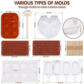 123 Pcs Heart Silicone Molds Set for Chocolate Includes 1x Breakable Heart Mold,2x Cocoa Bomb Molds,1x 8 Cavities Heart Mold,15x Wood Hammers,2x Number and Letter Molds,2x Popsicle Molds,100x Sticks